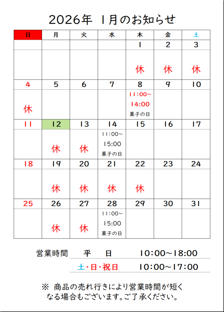 少し遅れましたが、12月のお休みと来年1月のお休みをお知らせいたします。
